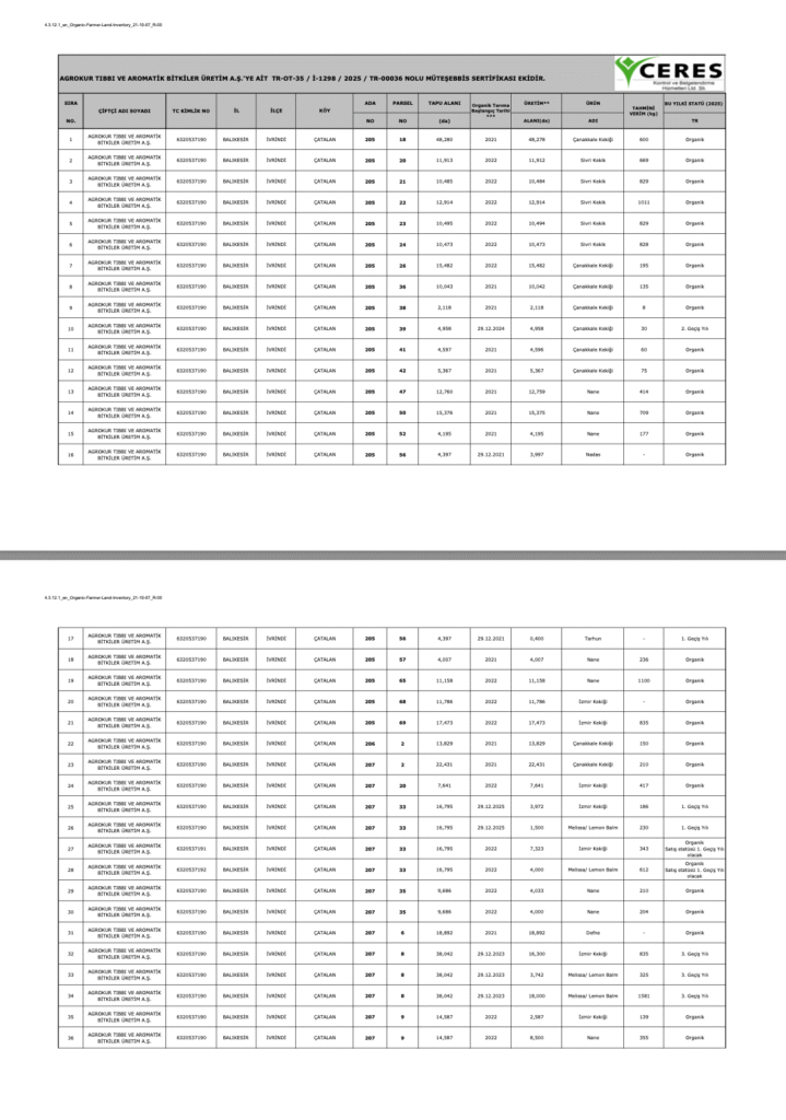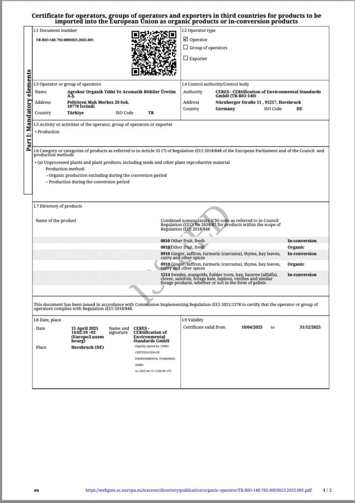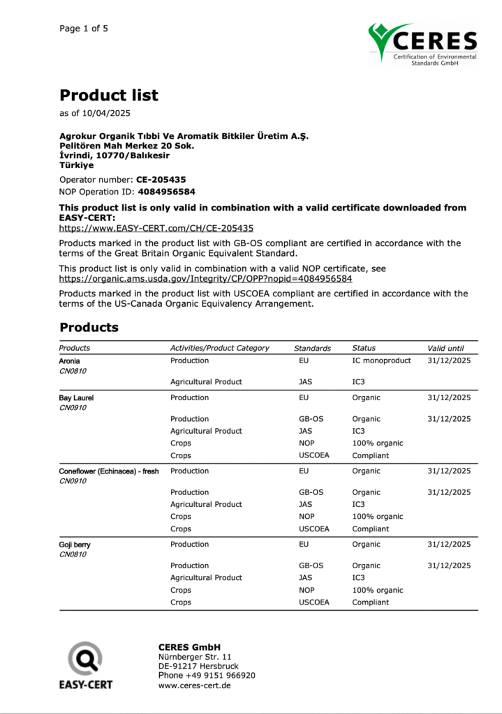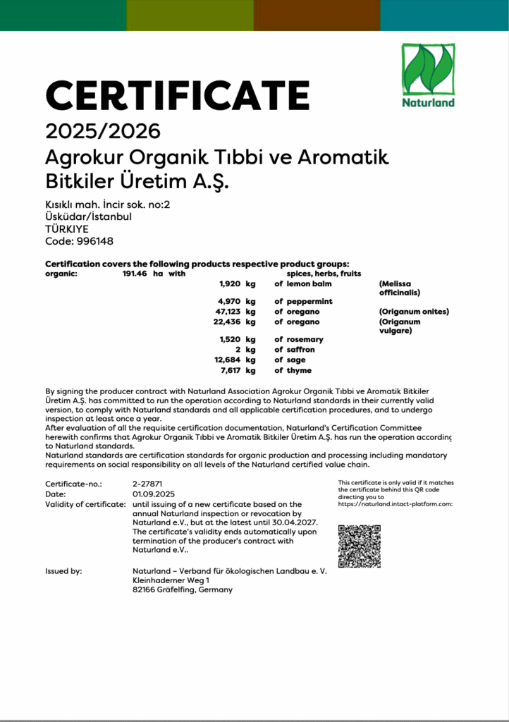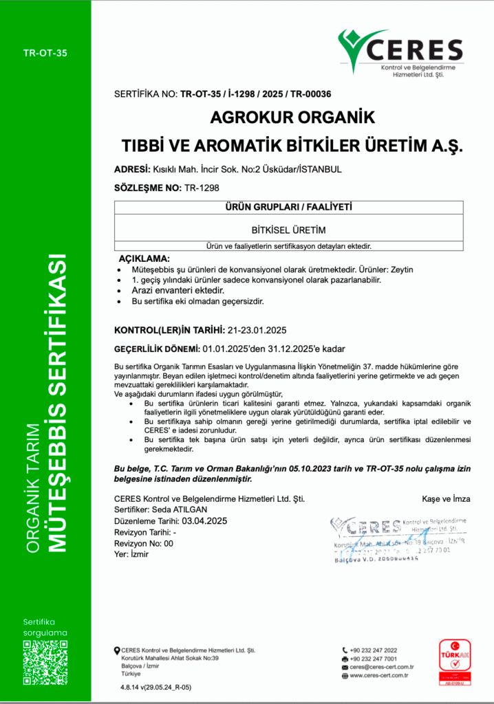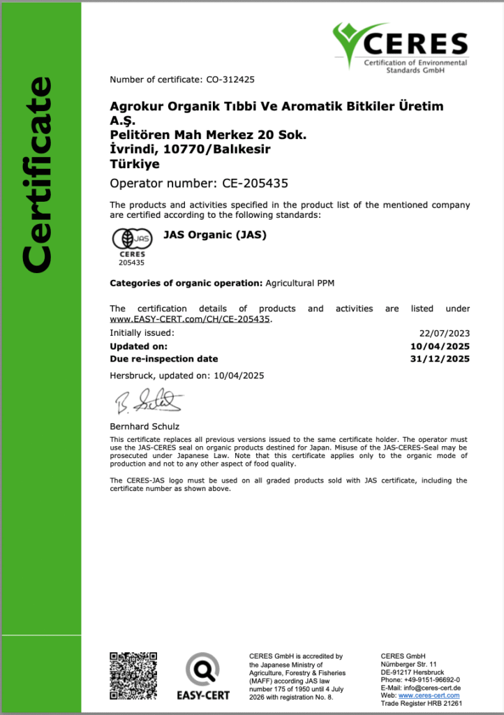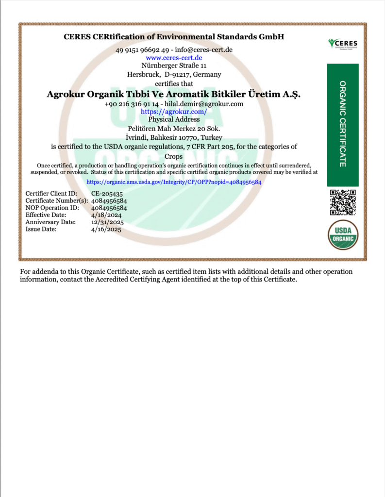 Sertifikalarımız Ceres tarafından belgelendirilmiş organik tıbbi aromatik bitklerimiz Japonya, Amerika, Avrupa Birliği ve Türkiye organik regülasyonlarına uyumludur.